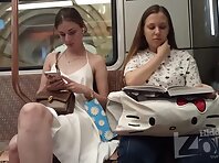 Upskirt of a girl in a short black and white dress. Her pubic area and shaved crotch in...